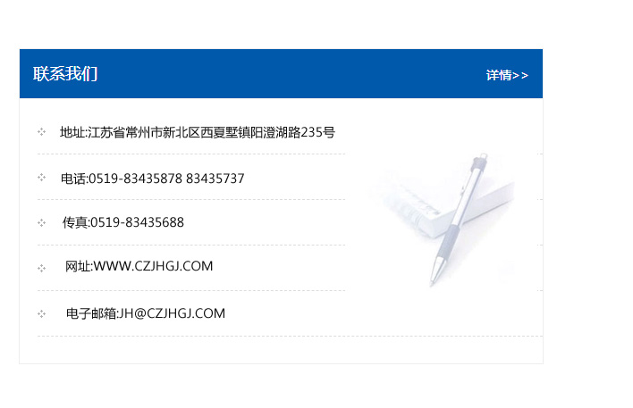 地址:常州市新北區友邦商務大廈1幢16、17層  電話:0519-85101652  傳真:0519-85112595  郵編:213022  網址:www.cz-jiayue_cn.whwqjc.com  郵箱:xiajifengaa@163.com